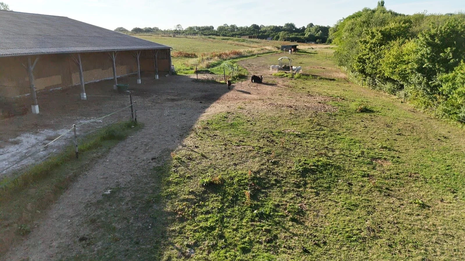 Le pré des poneys, avec le grand hangar ouvert qui leur sert d’abri