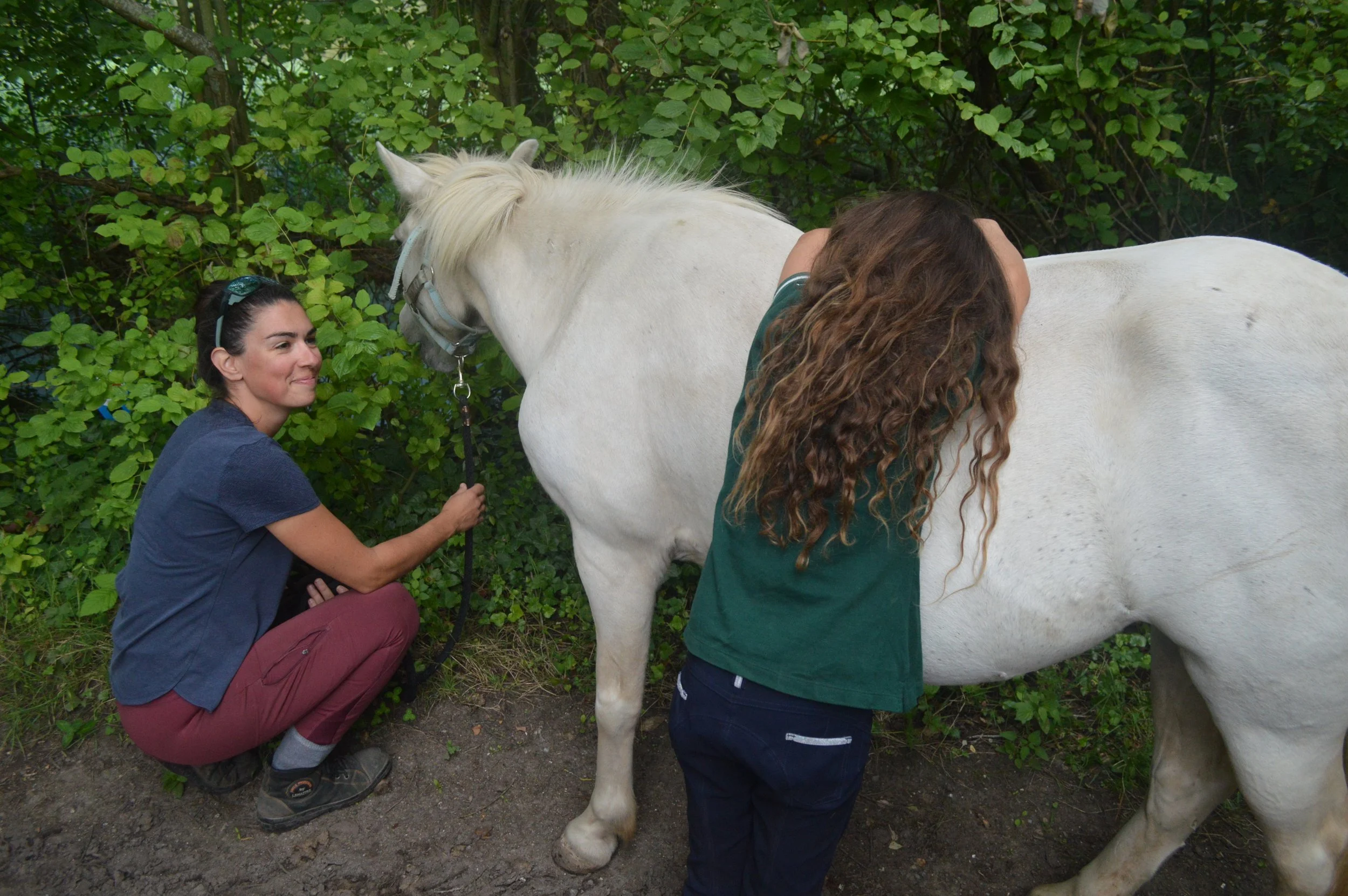 L’odeur de son corps, la texture fine et douce de son museau, celle différente de ses crins, la brillance et la chaleur de son poil au soleil, les bruits et souffles qu’il émet, son occupation horizontale de l’espace alors que nous sommes verticaux, c’est tout un être à découvrir en douceur.