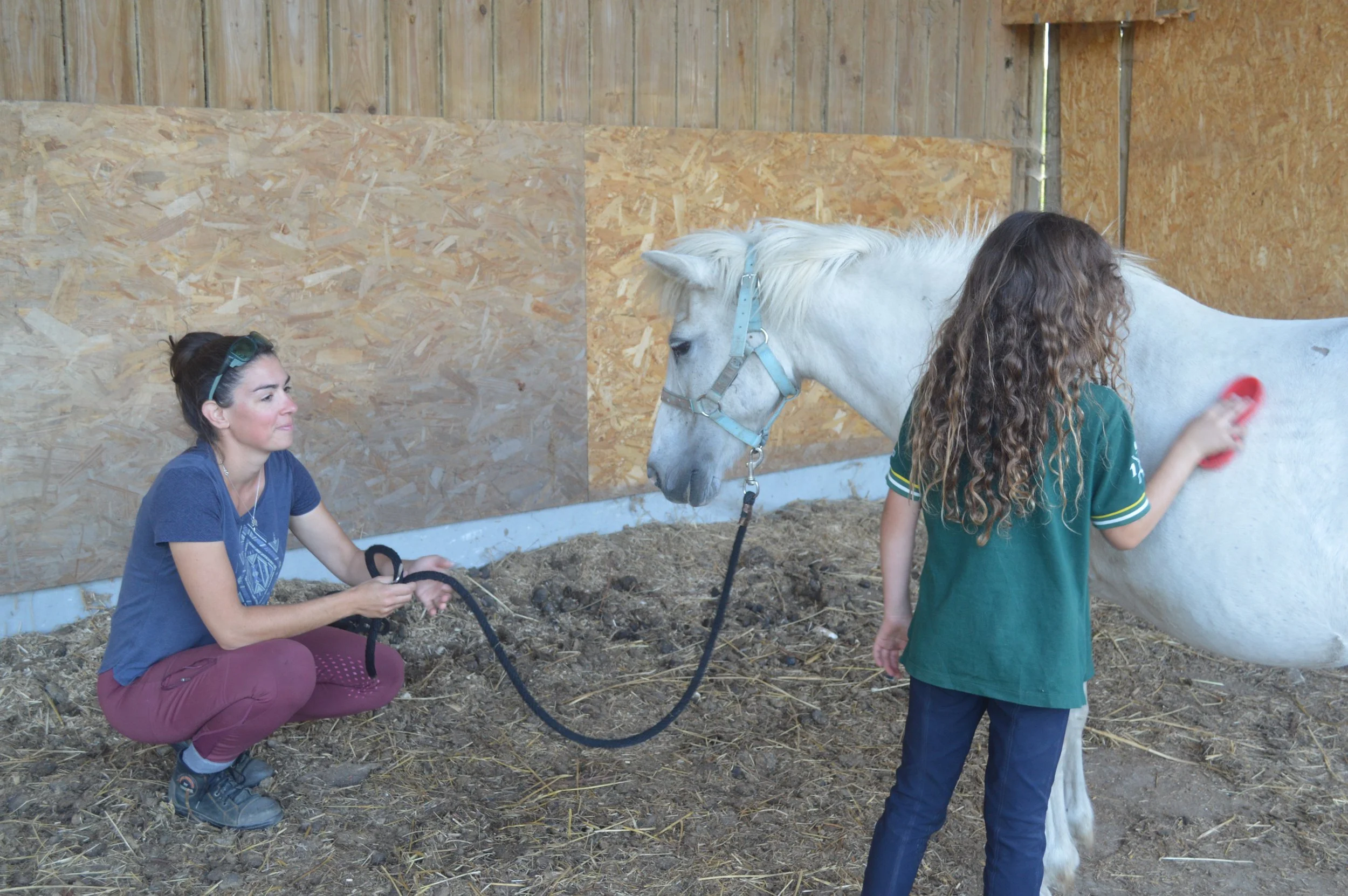 Cette activité permet également d’apprendre à quoi sert chaque brosse et comment s’en servir, à respecter le matériel et à en prendre soin, à réaliser les mouvements adéquats et à se coordonner, d’apprendre à soulever chacun de pieds de l’équidé en sécurité, à prodiguer du soin à un autre organisme vivant et à en être responsable.